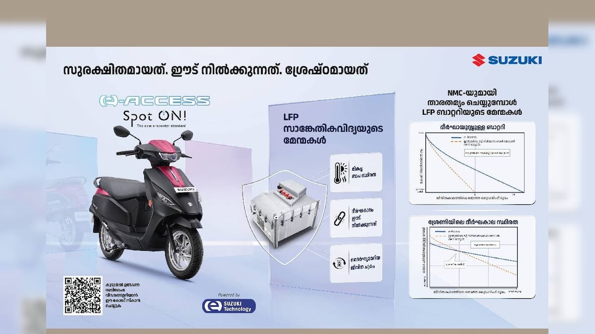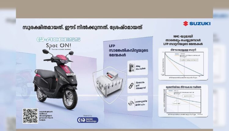 ജാപ്പനീസ് ഇരുചക്ര വാഹന നിർമ്മാതാക്കളായ സുസുക്കി ഇന്ത്യയിലെ തങ്ങളുടെ ആദ്യത്തെ ഇലക്ട്രിക് സ്കൂട്ടറായ ഇ-ആക്സസ് നിർമ്മിച്ചിരിക്കുന്നത് ലിഥിയം അയൺ ഫോസ്ഫേറ്റ് ബാറ്ററി ഉപയോഗിച്ചാണ്. ഇന്ത്യയിൽ കമ്പനിയുടെ ഏറ്റവും കൂടുതൽ വിൽക്കുന്ന ആക്‌സസ് 125 ഗിയർലെസ് സ്‌കൂട്ടറിന്റെ ഇലക്ട്രിക് പതിപ്പാണിത്.