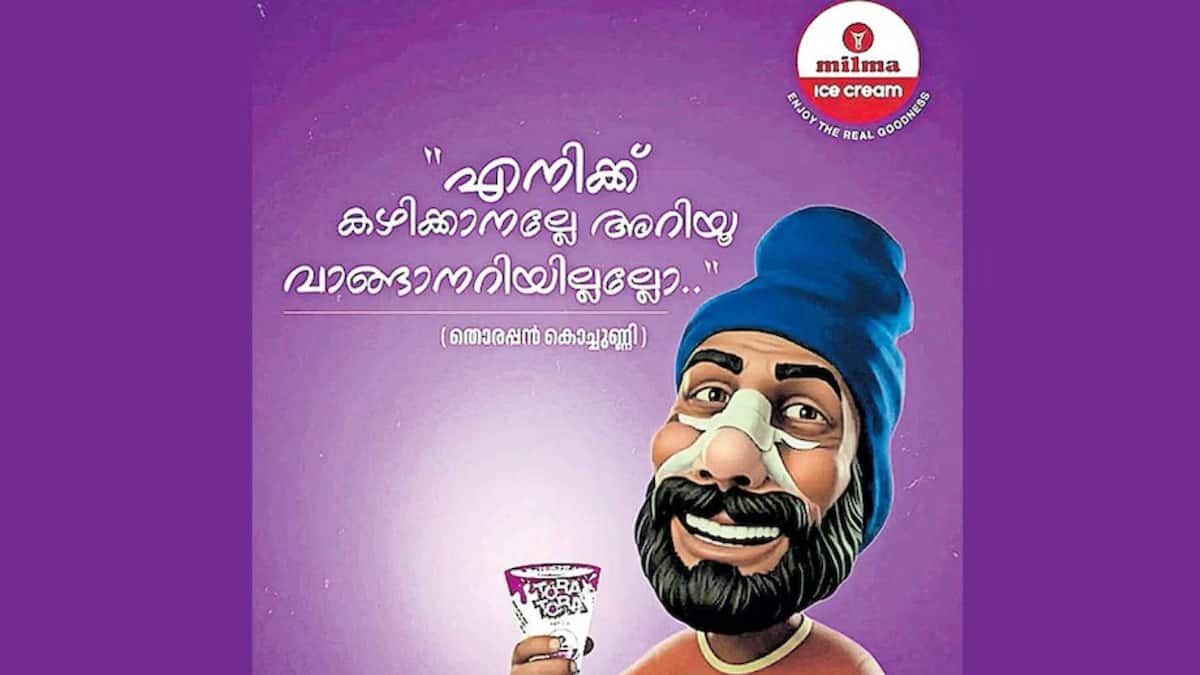 മൂക്കിനു മുകളിൽ പ്ലാസ്റ്റർ ഒട്ടിച്ച ആളെയാണ് പരസ്യത്തിൽ അവതരിപ്പിച്ചത്. ‘എനിക്കു കഴിക്കാനല്ലേ അറിയൂ, വാങ്ങാനറിയില്ലല്ലോ– തൊരപ്പൻ കൊച്ചുണ്ണി’ എന്നാണ് മിൽമ ഐസ്ക്രീം പിടിച്ചു നിൽക്കുന്നയാളുള്ള പരസ്യത്തിലെ വാചകം. ‘സിഐഡി മൂസ’ സിനിമയിൽ ഹരിശ്രീ അശോകൻ അവതരിപ്പിച്ച കഥാപാത്രമാണ് തൊരപ്പൻ കൊച്ചുണ്ണി. ‘എനിക്ക് എഴുതാനല്ലേ അറിയൂ, വായിക്കാൻ അറിയില്ലല്ലോ’ എന്ന സിനിമയിലെ ഡയലോഗ് അന്ന് പ്രേക്ഷകർ നെഞ്ചേറ്റിയതാണ്.