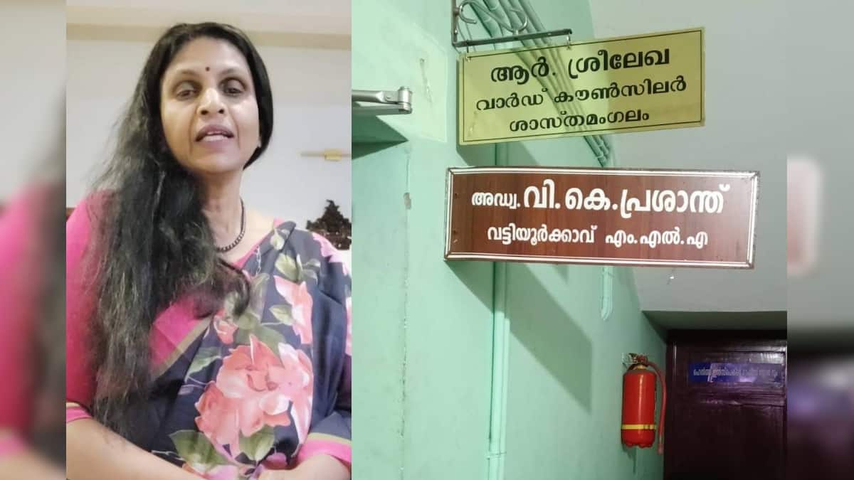 വി കെ പ്രശാന്തിന്റെ നെയിം ബോർഡിന് മുകളിൽ പുതിയ നെയിം ബോർഡുമായി ആർ ശ്രീലേഖ| R Sreelekha installs a new nameboard on top of the existing nameboard of V K Prasanth mla | Kerala