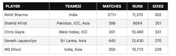 19 വർഷം നീണ്ട ഏകദിന കരിയറിപാകിസ്ഥാൻ, ഏഷ്യ ഇലവൻ, ഐസിസി ഇലവൻ എന്നിവയ്ക്കായി 398 ഏകദിനങ്ങളിൽ നിന്നാണ് അഫ്രീദി 351 സിക്സറുകനേടിയിയത്. അതേസമയം റാഞ്ചിയിൽ നടക്കുന്ന മത്സരം രോഹിത്തിന്റെ ഇന്ത്യയ്‌ക്കായുള്ള 277-ാമത്തെ ഏകദിന മത്സരമാണ്.