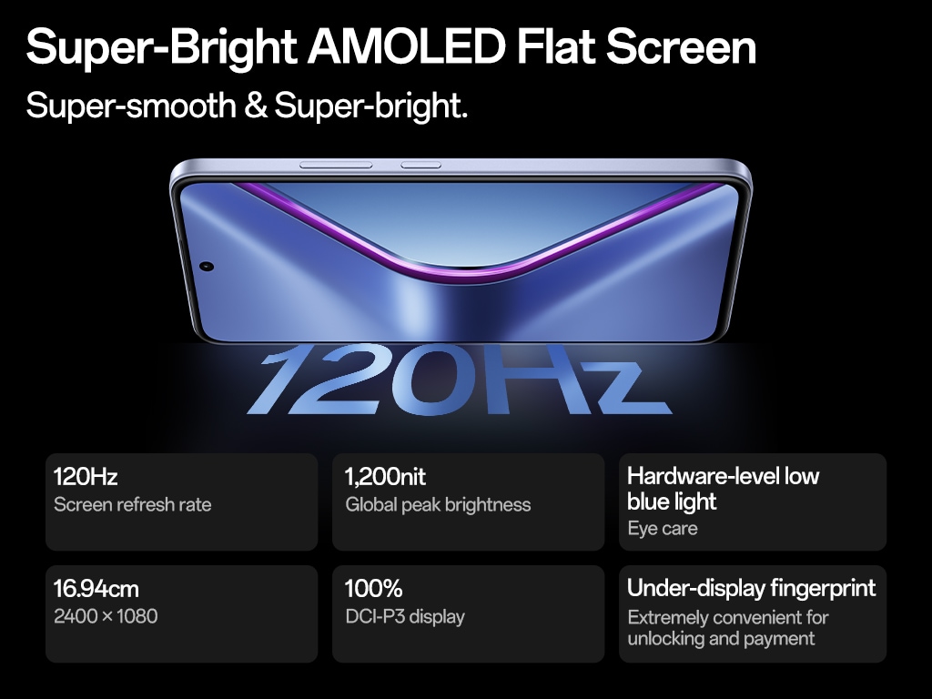 92.2% സ്‌ക്രീൻ-ടു-ബോഡി അനുപാതമാണ്. ക്വിക്ക് അൺലോക്കിന് ഇൻ-ഡിസ്‌പ്ലേ ഫിംഗർപ്രിന്റ് സെൻസർ ഉണ്ട്. ഗ്ലോവ് മോഡ്, വെറ്റ് ടച്ച്, ഔട്ട്‌ഡോർ മോഡ് എന്നിവ ചേർത്തിരിക്കുന്നു. മഴയിലും വിയർപ്പിലും ശൈത്യകാലത്തും പോലും ഈ ഫോൺ മികച്ച രീതിയിൽ പ്രവർത്തിക്കുന്നു, എപ്പോഴും യാത്രയിലായിരിക്കുന്ന ഗിഗ് തൊഴിലാളികൾക്കും ഇത് അനുയോജ്യമാണ്